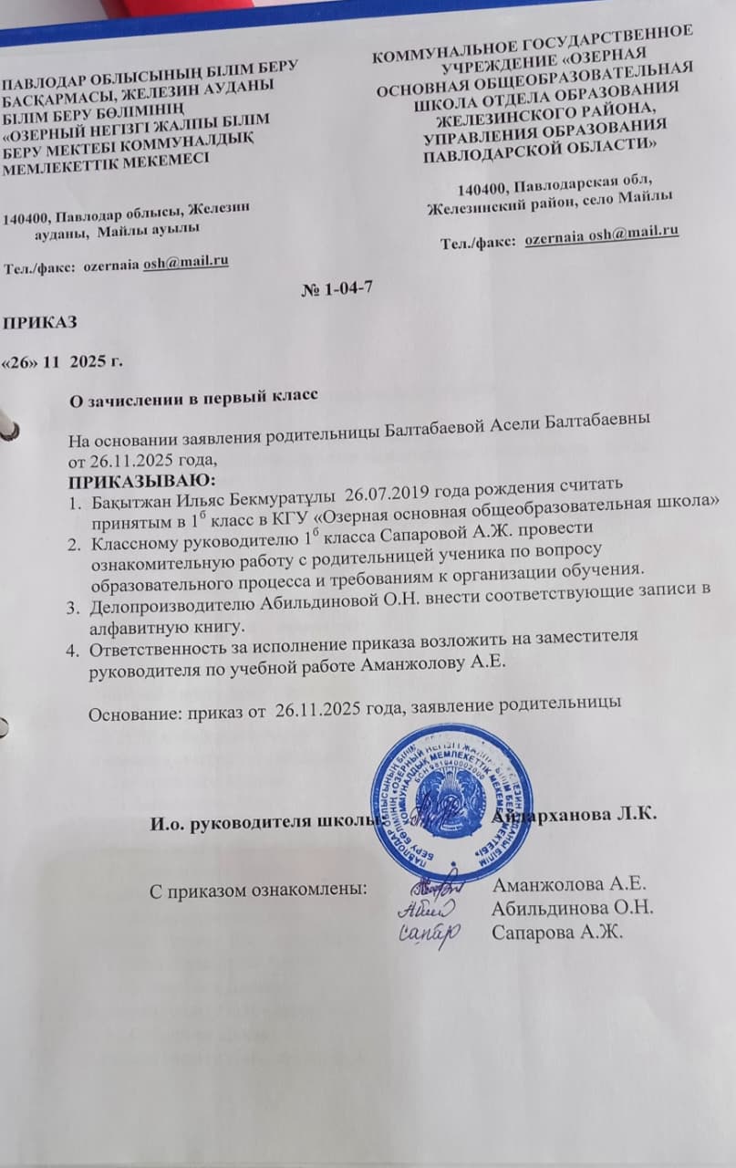 КГУ «Озерная основная общеобразовательная школа» отдела образования Железинского района, управления образования Павлодарской области
